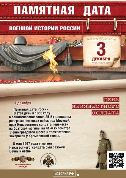 День Неизвестного солдата — памятная дата в России, с 1997 года отмечаемая ежегодно 3 декабря в память о российских и советских воинах, погибших в боевых действиях на территории страны или за её пределами.