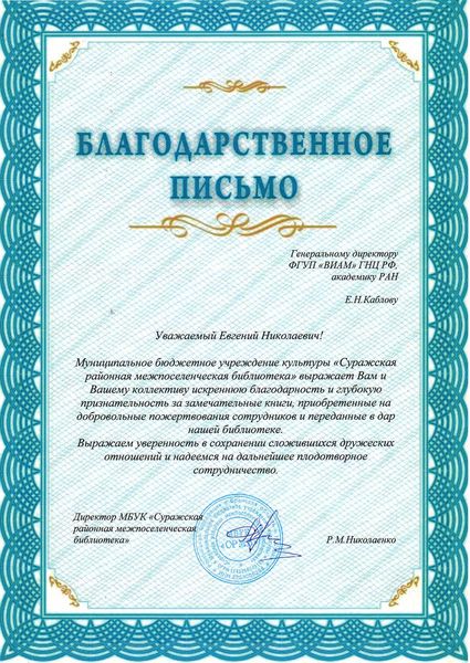 В рамках проводимой в этом году благотворительной акции Всероссийский научно-исследовательский институт авиационных материалов (ВИАМ) направил в средние общеобразовательные школы и региональные библиотеки книги. Среди счастливых обладателей новых печатных изданий и Суражская районная библиотека.