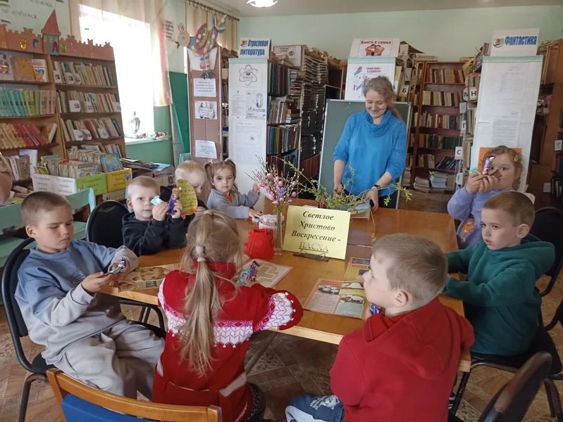 Во Влазовичской сельской библиотеке-филиале МБУК "Суражская районная межпоселенческая библиотека" для самых маленьких читателей — воспитанников дошкольного отделения МБОУ Влазовичская СОШ — прошел урок православия "Пасхальной радости сияние".