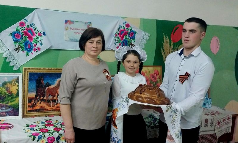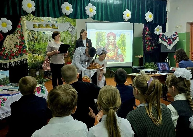 По доброму старинному обычаю всех гостей встречали хлебом‑солью. Дети бережно вынесли пышный каравай на расписном блюде, покрытом белоснежным рушником. В этом простом и древнем жесте — вся душа русской деревни: гостеприимство, тепло, уважение к гостю и к родной традиции.