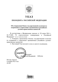 О сохранении общероссийской гражданской идентичности, укреплении традиционных духовно-нравственных ценностей, поддержании гражданского мира и согласия в стране в новом Указе Президента РФ. Подробнее