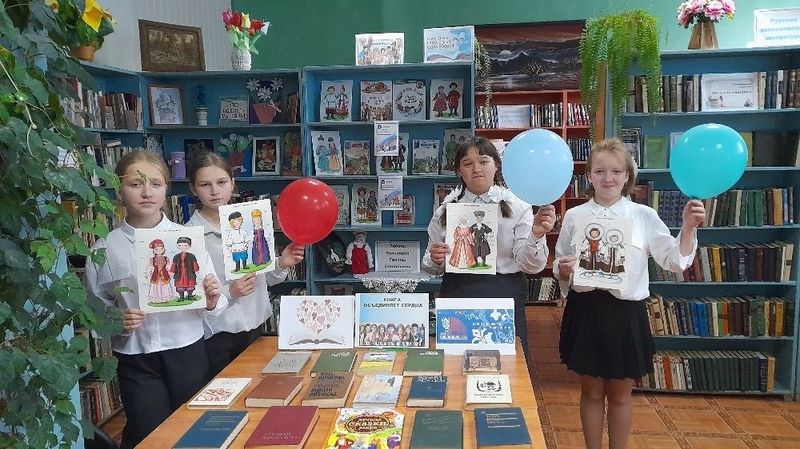 Библиотечное пространство преобразилось: стены украсили цитаты великих писателей о дружбе народов, портреты классиков литературы разных национальностей и иллюстрации к народным сказкам. А в центре – яркая тематическая выставка! Здесь можно было увидеть и «Слово о полку Игореве», и калмыцкий эпос «Джангар», и стихи Расула Гамзатова, и произведения писателей Сибири и Дальнего Востока.