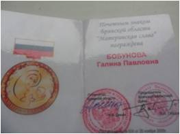 25 ноября 2005 года Галина Павловна бала награждена Почётным знаком Брянской области «Материнская слава».